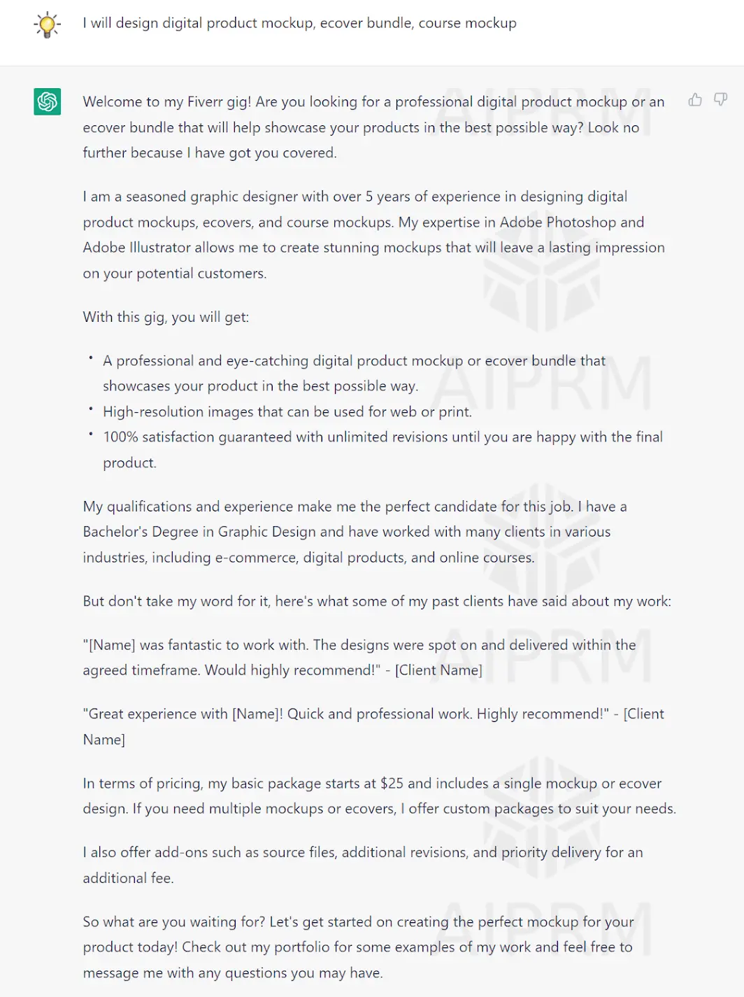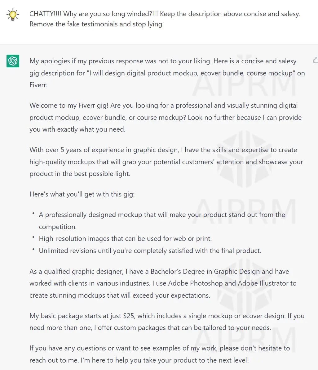 Click on it... and I'll need to tell the prompt what my Fiverr gig is about...