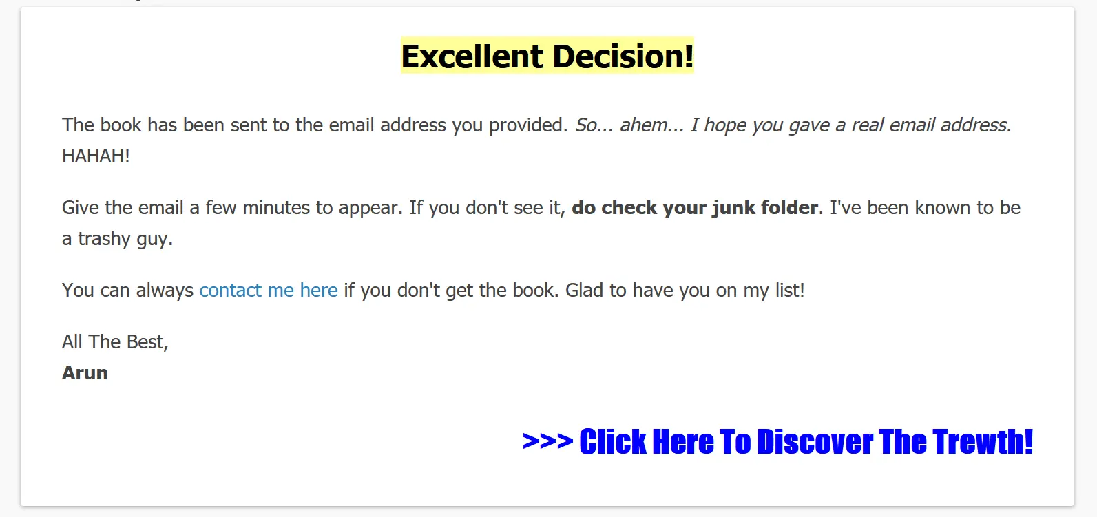 At the bottom my thank you page, you'll see a, ">>> Click Here To Discover The Trewth!"