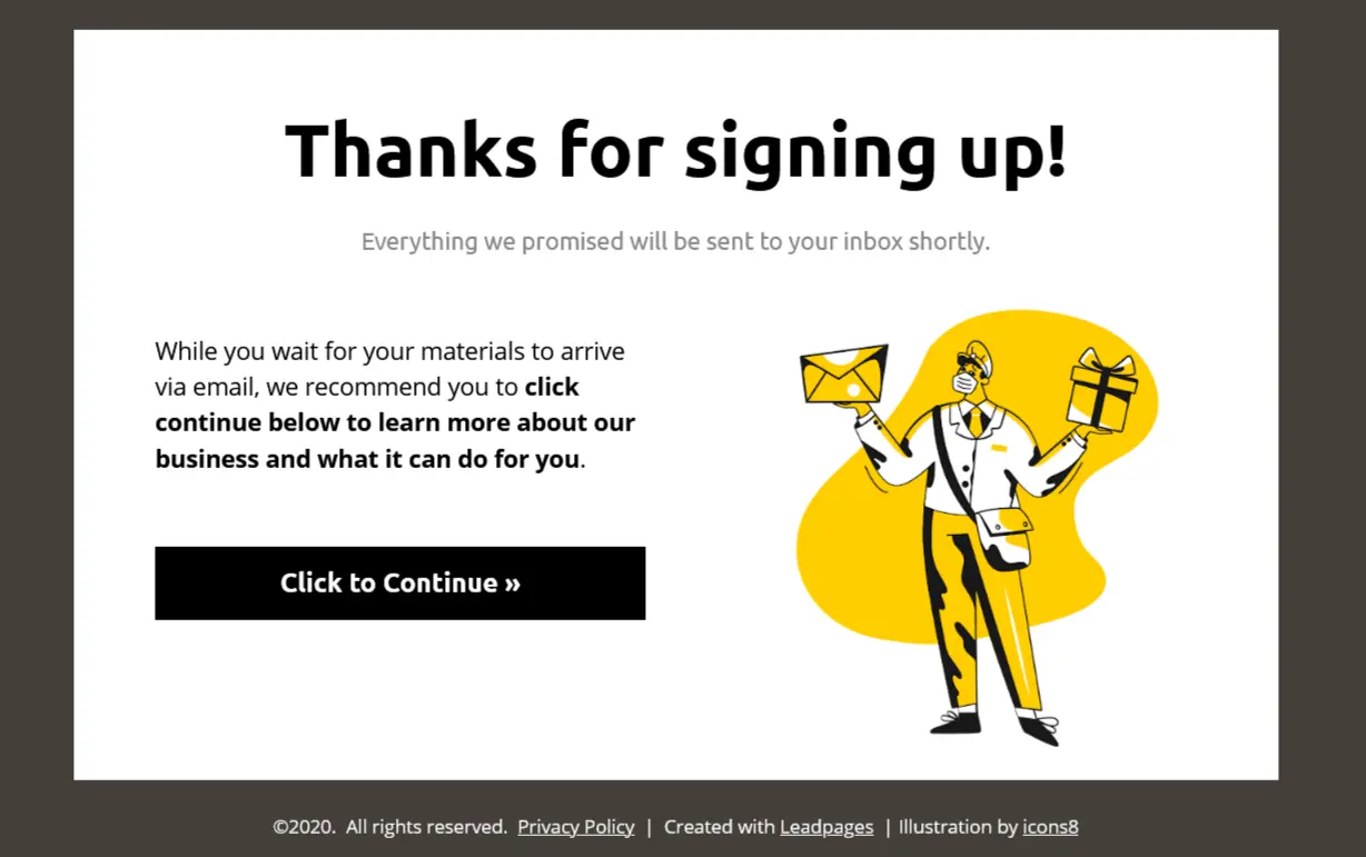 This is one of the thank you page templates in Leadpages. This too is perfect.
